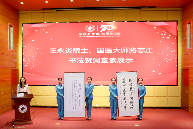 开幕仪式上,全国著名的中医教育家、中央文史研究馆馆员、中国工程院院士王永炎先生和102岁高龄的首届国医大师、国家级非物质文化遗产传统医药项目代表性传承人路志正先生,为潍坊医学院70周年校庆和杏吧论坛 的成立亲题贺词,寄予了殷切的期望与祝福。路志正先生的嫡传弟子丁霞教授宣读王永炎院士、路志正国医大师书法贺词。