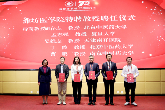 大会举行了潍坊医学院特聘教授聘任仪式,聘请丁霞教授、刘存志教授、孟志强教授、曹鹏教授、吴雄志教授为潍坊医学院特聘教授,卢国华代表学校和学术委员会为特聘教授颁发特聘教授证书。