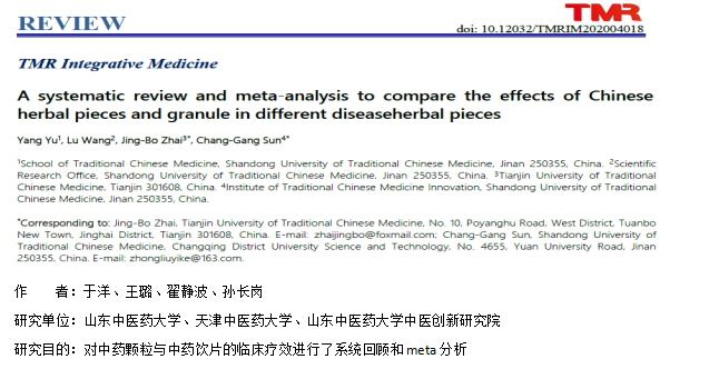 本次共识会参考吴雄志教授、高文远教授、孙长岗教授等国内外专家的前期研究基础,对5千多份相关研究做了系统评价并完成《中药颗粒与中药饮片临床疗效比较的系统评价和Meta分析》论文发表在TMR Integrative Medicine上。结果显示:中药颗粒在治疗感冒、骨质疏松等疾病中有效性和安全性与中药饮片相近;而在治疗胃脘痛、高血压中略优于中药饮片。