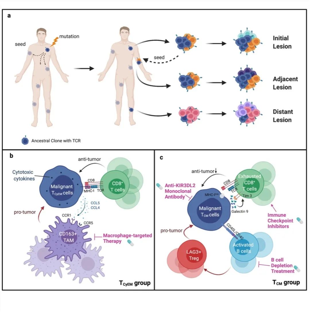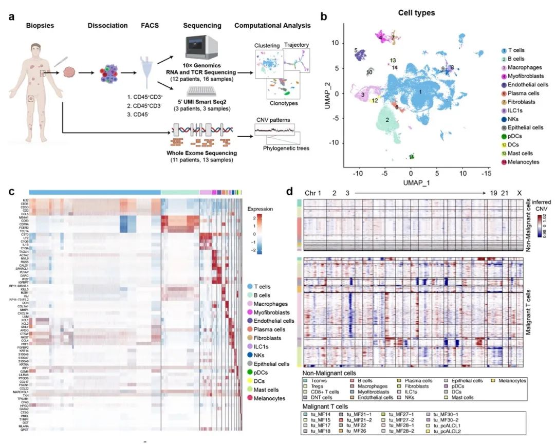 研究者通过对来自15例CTCL患者的19个肿瘤皮损进行单细胞转录组测序和TCR测序,准确定义了肿瘤性T细胞亚群并描绘了CTCL肿瘤内部复杂的多细胞免疫微环境图谱。分析发现每个样本中肿瘤细胞亚群有且只有一种TCR克隆型,在单细胞水平上明确了CTCL肿瘤细胞为单克隆起源。