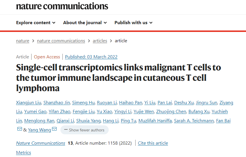 2022年3月3日北京大学生物医学前沿创新中心、北京未来基因诊断高精尖创新中心白凡教授课题组联合北京大学第一医院皮肤科汪旸教授课题组在Nature Communications上发表了题为Single-cell transcriptomics links malignant T cells to the tumor immune landscape in cutaneous T cell lymphoma的研究成果,该研究从单细胞水平绘制了CTCL肿瘤及其微环境免疫图谱,提出了肿瘤性T细胞的多次播散种植模型,并基于肿瘤性T细胞的分子特征及肿瘤微环境特征,提出了新的疾病分子分型。