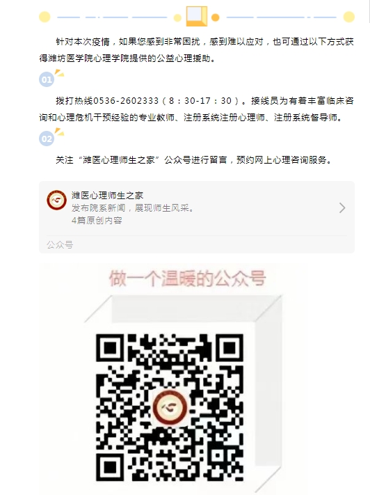 发挥学校心理学专业优势,心理学院组织专业教师成立心理辅导组,新学期普遍开展心理筛查,并开通心理热线及危机干预网络服务平台,及时掌握师生思想和心理动态,帮助排解不良情绪,引导树立积极理性的防疫心态和战胜疫情的信心勇气。