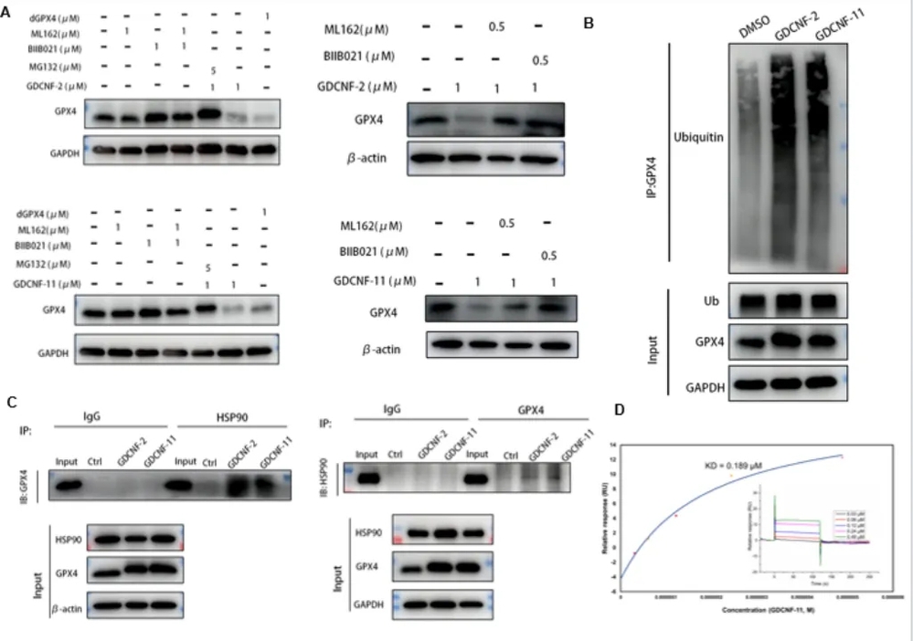 鉴于人类约 30% 的 E3 泛素酶可被热休克蛋白 HSP90 募集,形成分子伴侣复合物,作者用不同的 HSP90 靶向配体和改变接头类型,合成了两个系列多个结构不同的异型双功能分子。通过降解活性筛选,确定了其中两个化合物(GDCNF-2 和 GDCNF-11)在 HT-1080 细胞中表现出较好的 GPX4 降解活性(DC50 值分别为 0.18 和 0.08 μM)和降解持久性,但定量蛋白质组学揭示 GDCNF-11 具有更高的 GPX4 降解选择性。