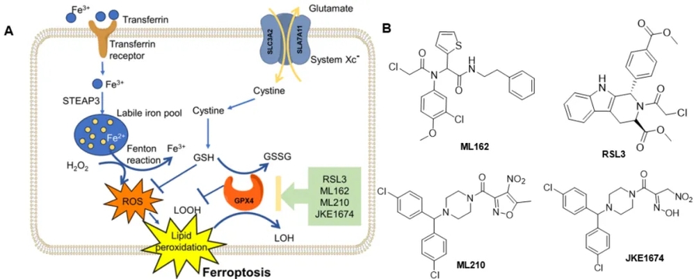 铁死亡是一种铁依赖性的、非凋亡性、程序性细胞死亡,因其独特的机制在肿瘤治疗和神经退行性疾病领域引起广泛关注。中国科学院杭州医学研究所覃江江课题组长期致力于铁死亡调控肿瘤转移与免疫逃逸的分子机 制及新药研发。2024 年,该课题组与中国科学院杭州医学所/浙江省肿瘤医院程向东教授团队和美国德克萨斯大学 MD 安德森癌症中心王凌华教授团队合作,构建了晚期胃腺癌的单细胞多组学图谱,并在此基础上发现胃腺癌在进展过程中通过上调 GPX4 来逃避癌细胞铁死亡,促进疾病进展与转移。该团队发现抑制 GPX4 或其它相关通路诱导铁死亡可显著缓解肿瘤生长和转移,并增强免疫治疗疗效(Gastroenterology 2024)。鉴于 GPX4 是调控铁死亡抵抗的关键酶,且在肿瘤中高表达,是抗肿瘤药物开发的有效靶点。覃江江课题组前期开发了靶向 GPX4 的小分子抑制剂(Eur J Med Chem 2024),但因 GPX4 的结合口袋较浅,如经典的 GPX4 小分子抑制剂 RSL3、ML162 等,均在药代动力学和选择性等方面存在局限性。