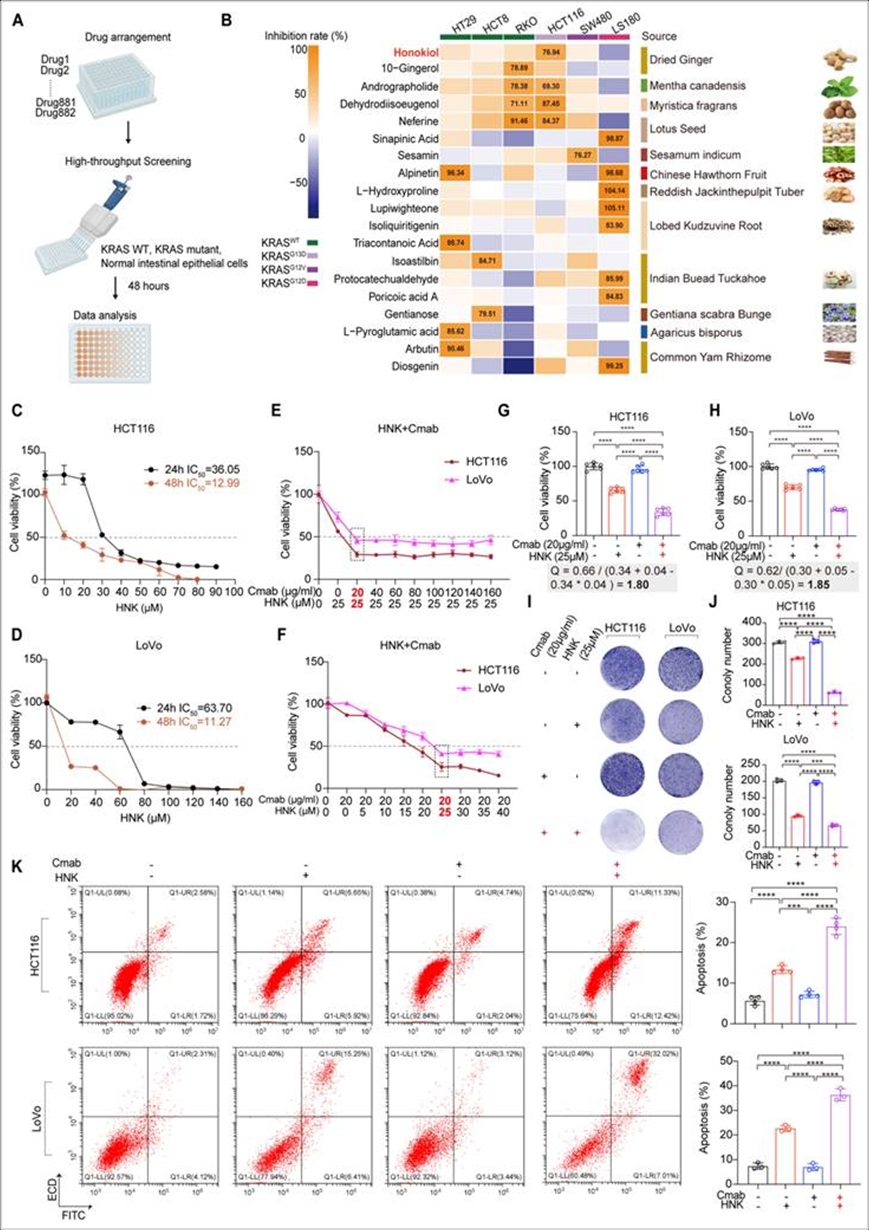 为了探索对KRASG13D突变敏感的化合物,作者使用高通量药物筛选平台对882种天然产物的化合物库进行体外筛选,以评估野生型细胞和 KRASG13D(HCT116)突变细胞中的药物敏感性,发现和厚朴酚(HKN)成为最佳候选者,对CRC KRASG13D细胞表现出显著的抑制作用。此外,和厚朴酚和西妥昔单抗的组合显著抑制CRC KRASG13D细胞增殖,促进细胞凋亡(图1)。