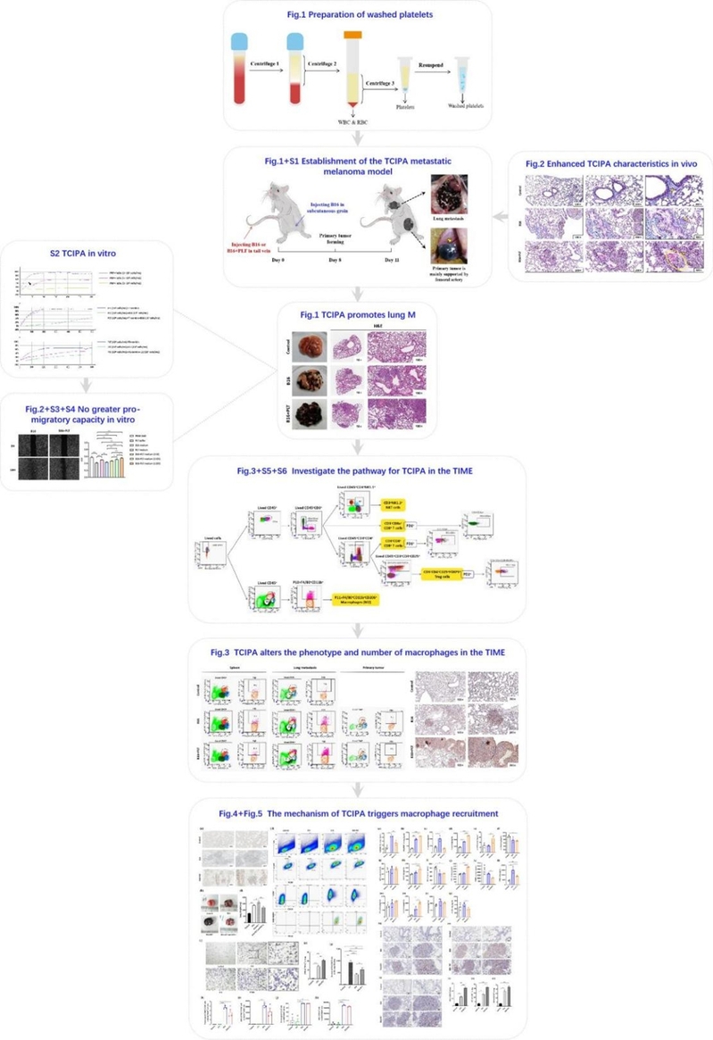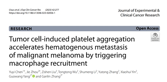 近日,张甘霖研究员在《Journal of Experimental & Clinical Cancer Research》杂志(IF 2022:11.3,JCR 1区)发表题为《Tumor cell-induced platelet aggregation accelerates hematogenous metastasis of malignant melanoma by triggering macrophage recruitment》的研究论文,发现肿瘤细胞诱导血小板聚集(TCIPA)加速恶性黑色素瘤血行转移的重要途径,为探索TCIPA下游机制建立动物模型工具,提示TCIPA/TEP可能为晚期恶性肿瘤血小板增多症患者抗转移的潜在治疗靶点。