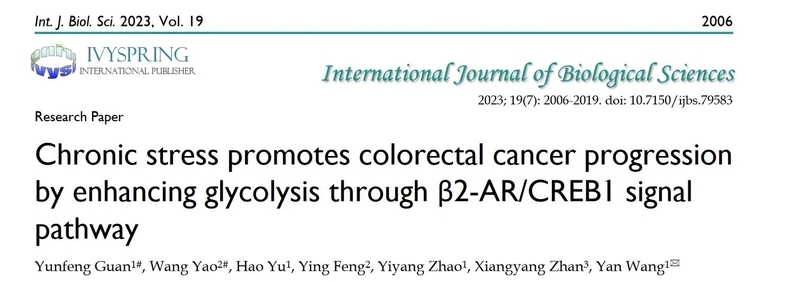 王炎研究员团队围绕中医情志应激在肿瘤中发生发展中的作用展开研究,深度挖掘中医传统情志理论及方药,聚焦肿瘤患者身心健康,不断在中医药防治大肠癌领域取得新进展。前期研究团队已证实,中药复方小柴胡汤及逍遥散等柴胡类方可以调控肠道菌群从而缓解情志应激下的大肠癌进展。基于此,团队进一步对情志应激如何促进大肠癌发展进行了深入的机制研究,并以“Chronic stress promotes colorectal cancer progression by enhancing glycolysis through β2-AR/CREB1 signal pathway”为题在国际学术期刊International Journal of Biological Sciences(Q1区 IF 9.2)发表论文。本研究利用病证结合小鼠模型,创新性阐述慢性情志应激通过肾上腺素激活β2-AR/PKA/CREB1信号通路,促使肿瘤细胞代谢重编程,进而导致大肠癌进展的作用机制。本研究为中医情志理论指导临床中医药防治大肠癌的全程化、精准化诊疗方案的制定提供了科学依据。