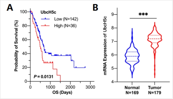 研究首先利用公共数据集TCGA的转录组数据发现与正常组织相比,UbcH5c在胰腺癌组织中高表达(图1B),且UbcH5c的高表达与胰腺癌患者不良预后相关(图1A),表明E2UbcH5c可能作为治疗胰腺癌的靶点。