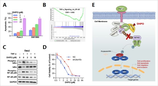 总之,研究证明UbcH5c与胰腺癌的临床相关性,并发现了一种有效的UbcH5c抑制剂DHPO,它通过抑制NF-κB信号通路在体外和体内的胰腺癌模型中显示出抗肿瘤的效果(图3E),为胰腺癌提供了一个新的靶点,并为胰腺癌的治疗提供了一种候选药物。