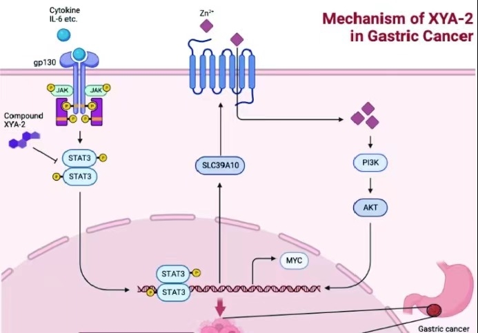 STAT3的磷酸化对于其二聚化及下游靶标基因的转录激活非常关键,而STAT3的二聚化又依赖于SH2结构域间的相互作用。因此,研究人员长期致力于寻找直接作用于SH2结构域并阻断STAT3二聚化及其转录活性的小分子药物。我们通过筛选发现一种新型STAT3抑制剂XYA-2,它与STAT3 SH2结构域相互作用(Kd=3.29μM)并抑制IL-6诱导的STAT3磷酸化和核转入。体外研究发现XYA-2对多种胃癌细胞株有显著抑制活性,其IC50值介于0.5至0.7μΜ之间。此外,XYA-2被发现能显著抑制胃癌MGC803和MKN28细胞的克隆形成和迁移。在MKN28衍生的异种移植小鼠模型和MGC803衍生的原位移植小鼠模型中,腹腔注射XYA-2(10 mg/kg/day,7天/周)能显著抑制肿瘤生长,且无明显的宿主毒性。在患者来源的异种移植(PDX)小鼠模型中,XYA-2表现出相似的肿瘤抑制活性,并延长了荷瘤小鼠的存活时间。基于转录组和蛋白质组整合分析的机制研究表明,XYA-2可能通过抑制STAT3 的两个下游基因MYC和SLC39A10表达来发挥其抗癌活性。综上所述, XYA-2可能是用于治疗胃癌的有效STAT3抑制剂,而MYC和SLC39A10的双重抑制有望成为STAT3驱动的癌症的有效治疗策略。