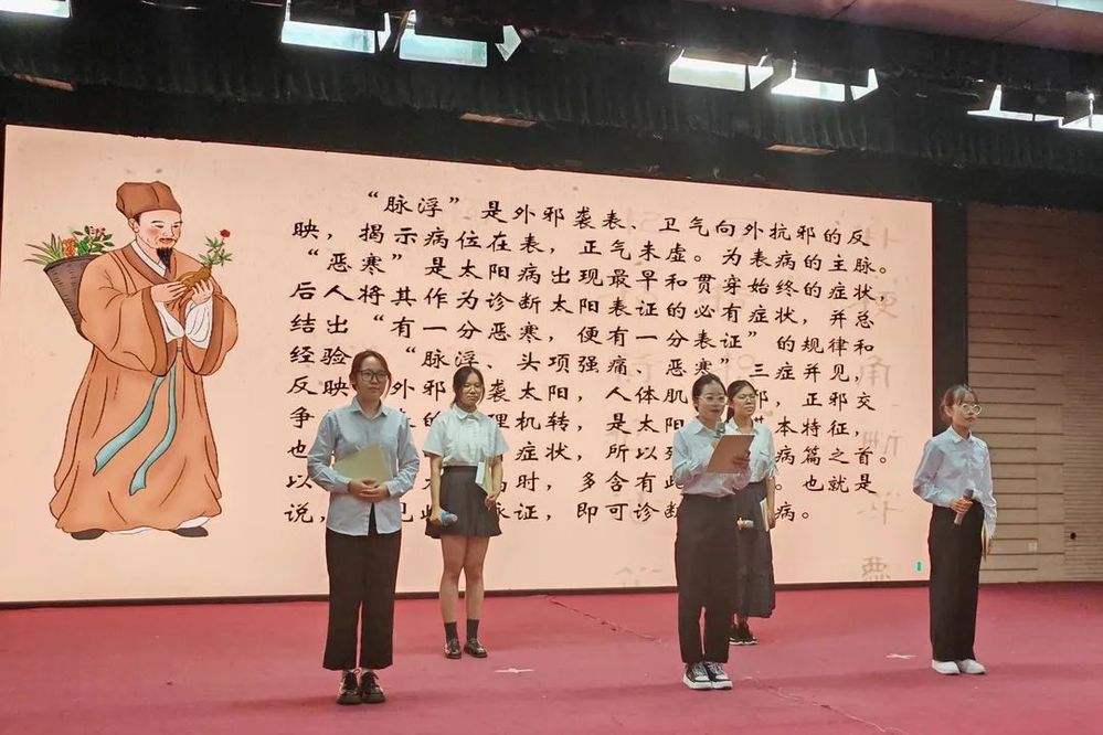 首先上场的是来自护理学院的代表队,她们分享了中医经典《伤寒论》。《伤寒论》是中医学的奠基之作,为中国传统医学做出了巨大贡献。队伍成员从外感病的病因病机到诵读此书带来的收获进行了细致讲解,获得了热烈的掌声。