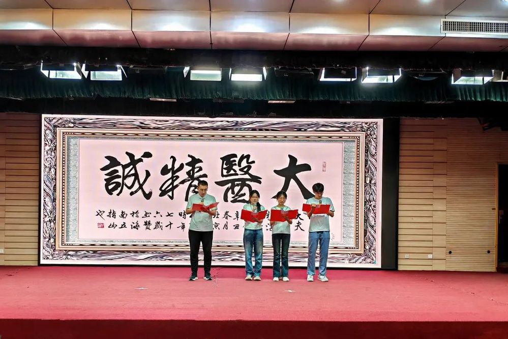 23级中医一班的同学朗诵经典《大医精诚》,他们用慷慨激昂的语调宣读大医之德、大医之心、大医之慈、大医之诚,立誓要发扬大医精神,普救含灵之苦,为中医药事业发展贡献力量。庄重严肃的气氛令在场观众无不动容、无不赞叹。