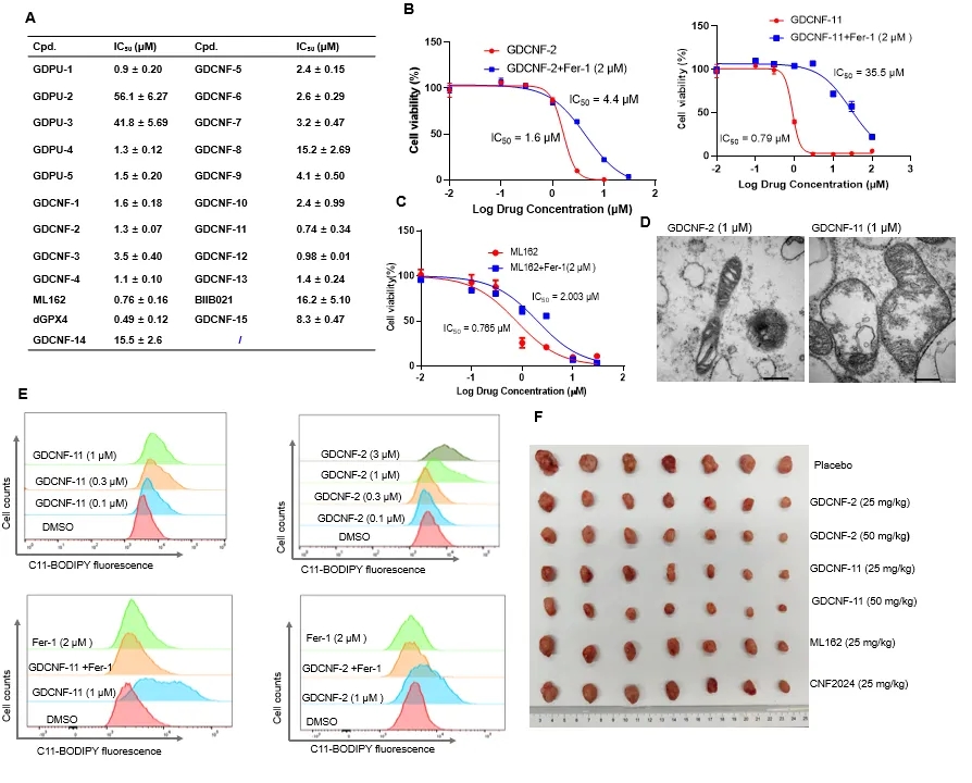 经过 GDCNF-2 或 GDCNF-11 处理后的 HT-1080 可出现铁死亡的典型特征如增加了胞内的脂质过氧化物(LPO)水平以及在生物透射电镜下可观察到线粒体脊减少、线粒体膜破裂等。在细胞存活实验以及 C11 染色实验中也证实了 GDCNF-11 比 GDCNF-2 和 GPX4 抑制剂 ML162 具有更高的铁死亡选择性。在后续的小鼠体内研究中,GDCNF-11 对肿瘤生长的抑制效果优于 HSP90 抑制剂 BIIB021 和 GPX4 抑制剂 ML162,且相比于 BIIB021 和 ML162 的联合给药,这种异型双功能分子在小鼠体内表现出较低的毒性。