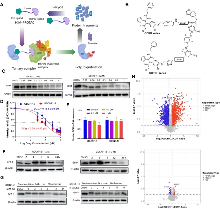 鉴于人类约 30% 的 E3 泛素酶可被热休克蛋白 HSP90 募集,形成分子伴侣复合物,作者用不同的 HSP90 靶向配体和改变接头类型,合成了两个系列多个结构不同的异型双功能分子。通过降解活性筛选,确定了其中两个化合物(GDCNF-2 和 GDCNF-11)在 HT-1080 细胞中表现出较好的 GPX4 降解活性(DC50 值分别为 0.18 和 0.08 μM)和降解持久性,但定量蛋白质组学揭示 GDCNF-11 具有更高的 GPX4 降解选择性。