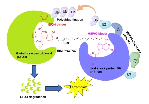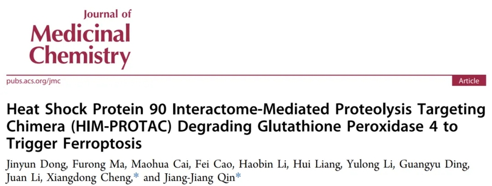 相关工作以Heat Shock Protein 90 Interactome-Mediated Proteolysis Targeting Chimera (HIM-PROTAC) Degrading Glutathione Peroxidase 4 to Trigger Ferroptosis 为题发表在药物化学领域内顶尖期刊 Journal of Medicinal Chemistry 上。