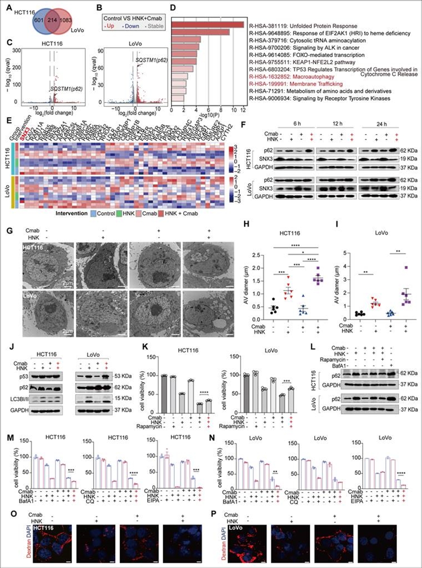 接着,作者通过转录组测序来确定参与协同效应的潜在途径和靶标,发现SQSTM1/p62的表达显著上调,GO分析显示共处理会影响自噬和膜运输途径,KEGG分析显示内吞作用途径发生显著变化。其中,差异基因SNX3在内吞途径中起关键作用。Western blot验证发现HNK和西妥昔单抗的组合导致p62蛋白的增加和SNX3蛋白的减少,电镜显示具有未消化内容物的自噬囊泡显著增加。