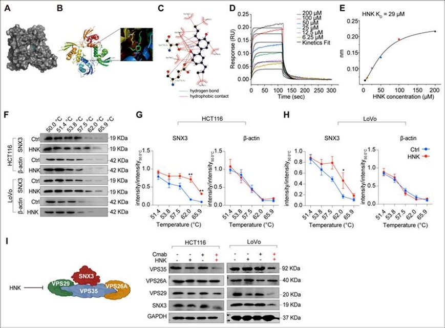 自噬和巨胞饮作用的受异常逆转录酶运输影响,作者观察到膜运输的改变和SNX3的相应减少,表明SNX3在和厚朴酚和西妥昔单抗的组合中起着至关重要的作用。此外,分子对接结果表明和厚朴酚与SNX3蛋白之间可能存在结合,并通过BLI、CETSA验证了和厚朴酚与SNX3的直接结合。为了进一步确定联合治疗后的逆转录酶功能,作者研究了SNX3在mRNA和蛋白质水平的表达,发现SNX3基因和蛋白在和厚朴酚和西妥昔单抗共同处理后的表达显著降低。这些数据表明HNK联合西妥昔单抗诱导SNX3-逆转录酶损伤(图3)。