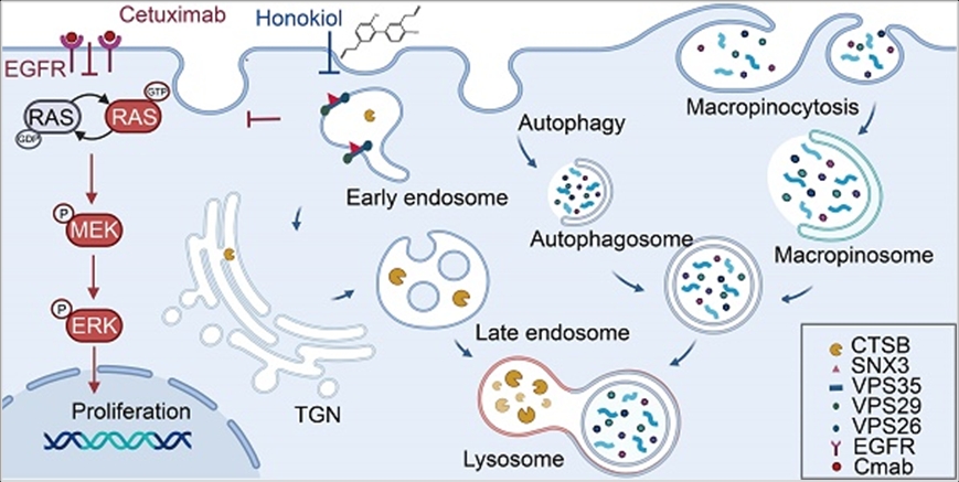 研究揭示了和厚朴酚和西妥昔单抗作为一种具有治疗潜力的组合,在体外和体内显示出更好的抗癌效果。和厚朴酚破坏SNX3逆转录酶功能,抑制自噬和和巨胞饮作用通量,以及EGFR信号通路。同时,功能失调的SNX3逆转录酶抑制RAS GDP向RAS GTP的转化,提高西妥昔单抗的敏感性,从而放大联合治疗的细胞毒作用。因此,和厚朴酚和西妥昔单抗的组合代表了治疗KRASG13D突变CRC的一种有前途的方法(图8)。