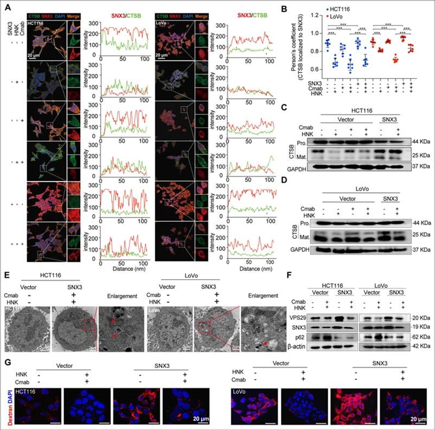考虑到SNX3逆转录酶在联合治疗中的损伤,作者研究了它是否会影响KRASG13D突变细胞中溶酶体的功能。结果表明和厚朴酚和西妥昔单抗联合治疗后标记酸性溶酶体区室的荧光染料的阳性细胞器减少。组织蛋白酶B(CTSB)是一种溶酶体酶,先前的研究表明逆转录酶功能障碍与CTSB的不当加工和分泌有关。作者发现HNK下调SNX3的表达,从而扰乱CTSB向溶酶体的转运。此外,HNK处理的细胞中成熟形式的CTSB急剧减少,表明HNK处理扰乱了蛋白水解的形成和成熟,这些数据表明HNK和西妥昔单抗的组合通过下调SNX3表达破坏溶酶体蛋白水解(图5)。