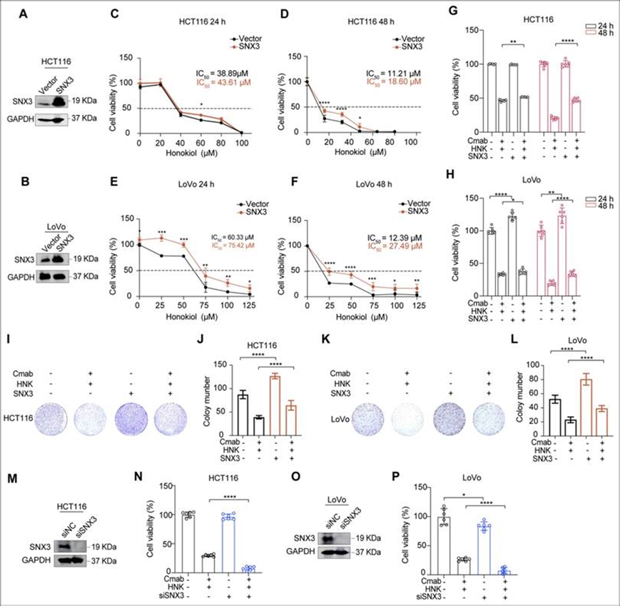 为了研究SNX3在体外肿瘤进展中的作用,作者构建了通过慢病毒感染过表达SNX3的稳定细胞系,发现SNX3过表达显著增加KRASG13D突变CRC细胞系中HNK的IC50值。此外,SNX3过表达在HNK和西妥昔单抗联合治疗中降低KRASG13D突变CRC细胞毒性。数据表明和厚朴酚通过破坏SNX3-逆转录酶来增加KRASG13D突变CRC细胞对西妥昔单抗的细胞毒性(图4)。