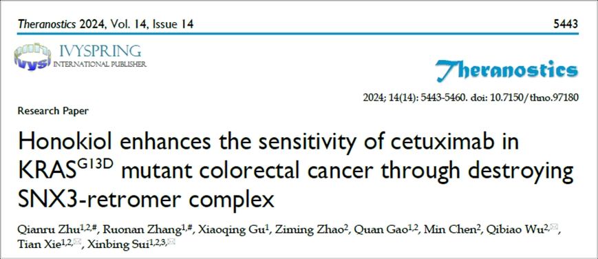 2024年8月26日,杭州师范大学药学院隋新兵/谢恬,澳门科技大学中医药学院吴其标团队在Theranostics(IF=12.4)上发表了题为“Honokiol enhances the sensitivity of cetuximab in KRASG13D mutant colorectal cancer through destroying SNX3-retromer complex”的文章,鉴定了和厚朴酚(honokiol,HNK)对KKRASG13D CRC细胞表现出特异性敏感性,此外,西妥昔单抗与和厚朴酚联合使用可协同增强在体内和体外模型中的敏感性。机制上,和厚朴酚抑制SNX3介导的运输,从而阻碍溶酶体蛋白水解能力并抑制自噬和巨胞饮作用通量。此外,和厚朴酚通过SNX3抑制RAS GDP向RAS GTP的转化,提高KRASG13D突变细胞对西妥昔单抗的敏感性。这些发现为扩大KRAS突变结直肠癌患者靶向治疗的适应症提供了一种有前途的策略。