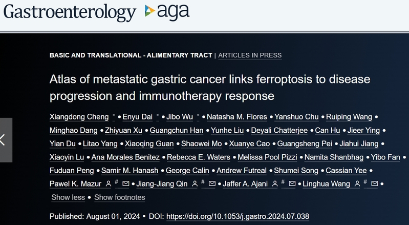 2024年8月1日,覃江江团队在Gastroenterology(IF=17.6)在线发表题为“Atlas of metastatic gastric cancer links ferroptosis to disease progression and immunotherapy response”的研究论文,该研究利用转移性胃癌的图谱将铁死亡与疾病进展和免疫治疗反应联系起来。